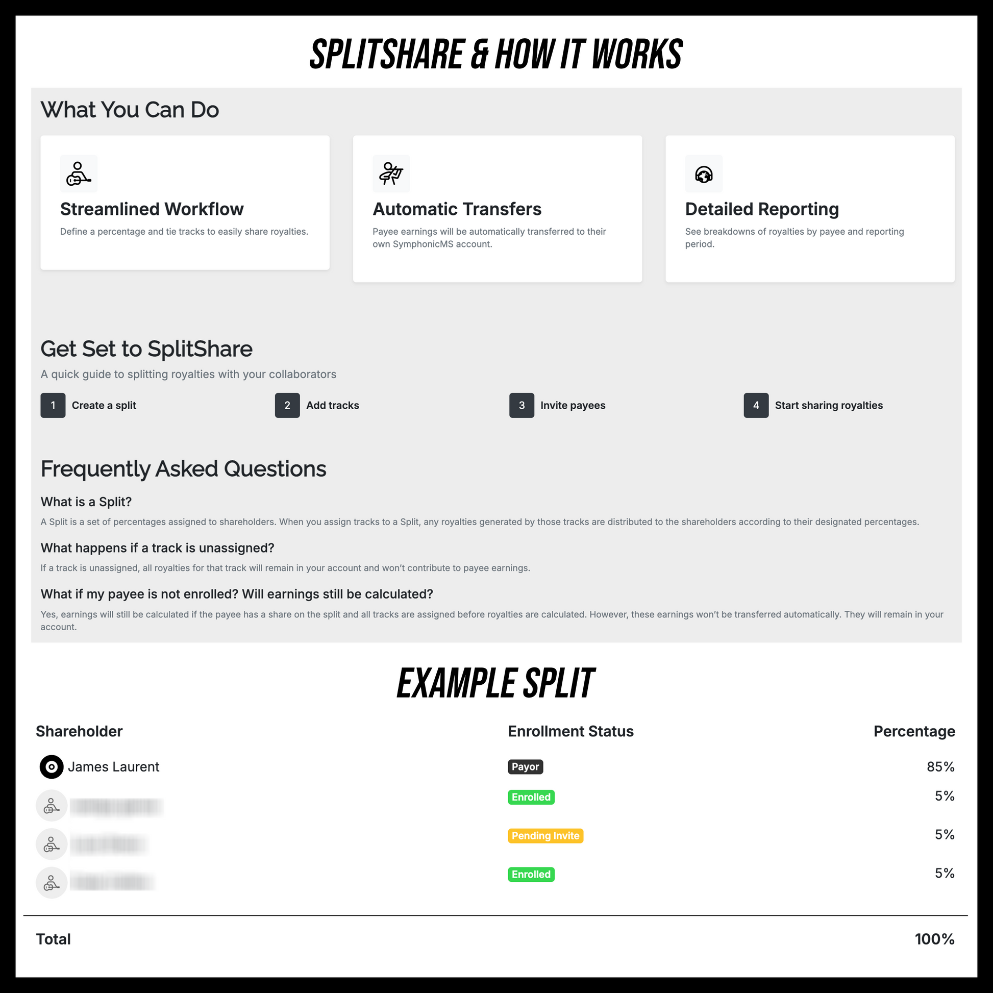 Upon Purchase your email will be added in to the Symphonic SplitShare system, you will receive an email prompting you with instructions on how to sign up and start collecting.