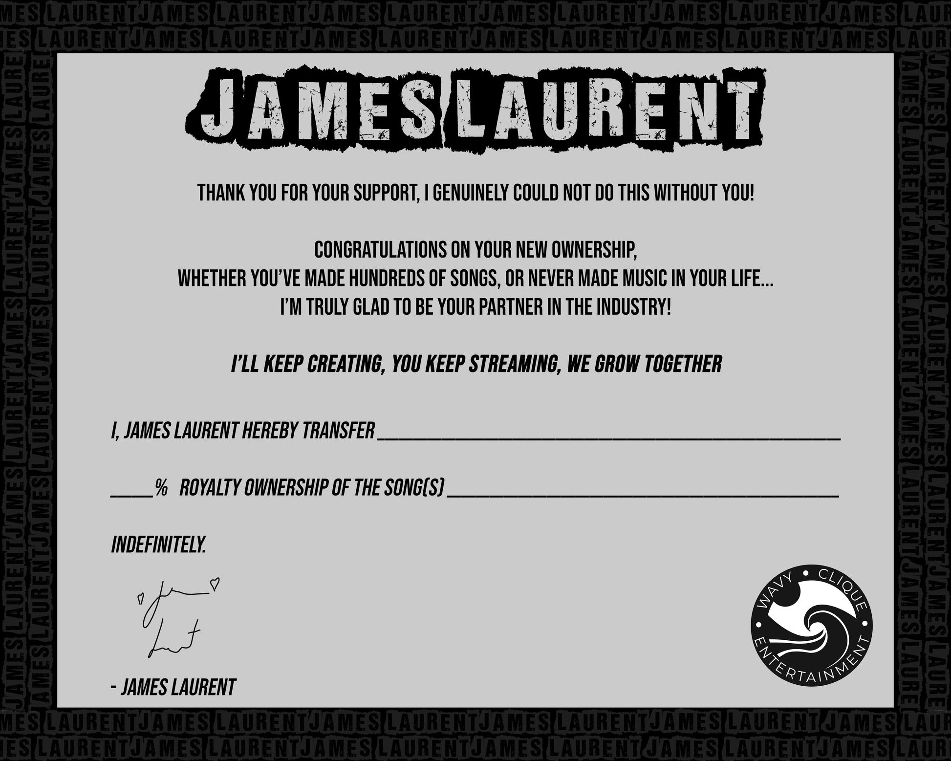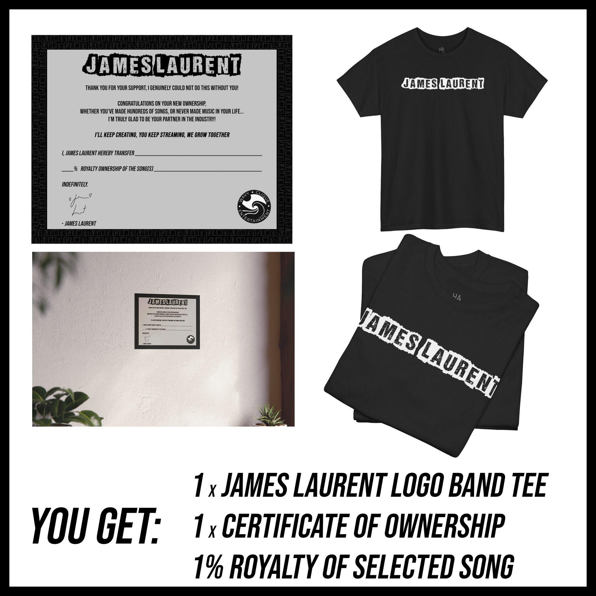 Each package comes with a James Laurent Band Logo Tee as well as a 10in by 8 in certificate of ownership with all the details of filled out respectively.